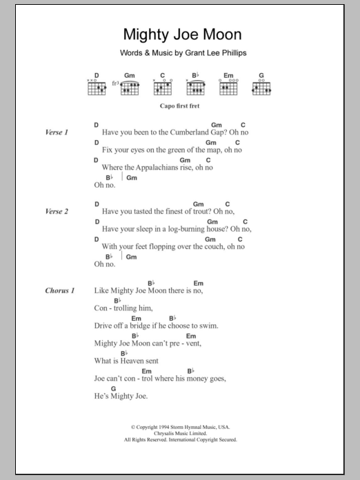 Download or print Grant Lee Buffalo Mighty Joe Moon sheet music, chords and digital score arranged for Guitar Chords/Lyrics. This Country score includes 2 page(s).