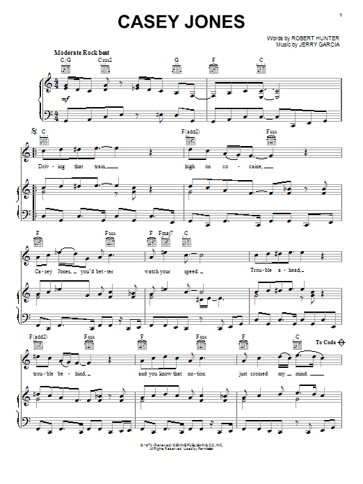 Download or print Grateful Dead Casey Jones sheet music, chords and digital score arranged for Guitar Tab (Single Guitar). This Pop score includes 11 page(s).