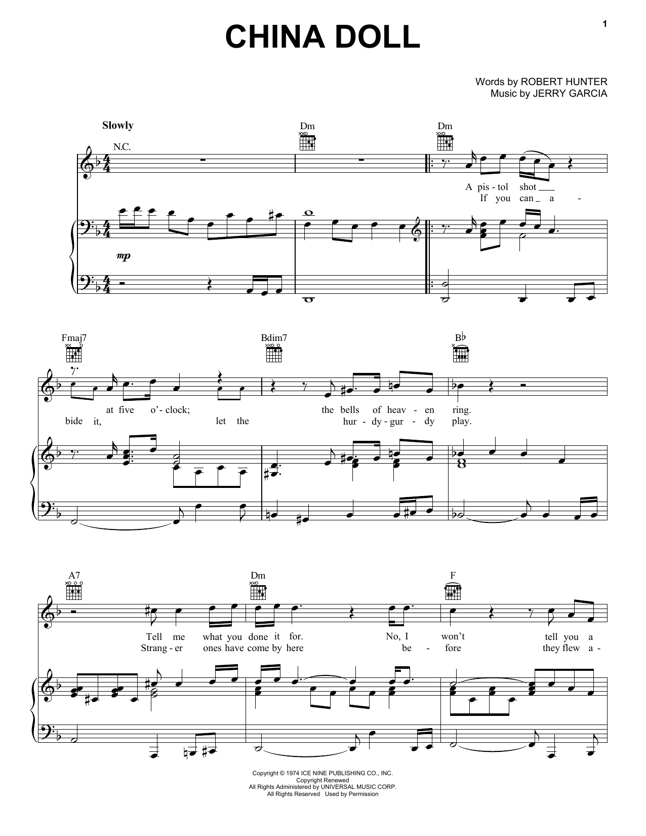 Download or print Grateful Dead China Doll sheet music, chords and digital score arranged for Piano, Vocal & Guitar Chords (Right-Hand Melody). This Pop score includes 3 page(s).