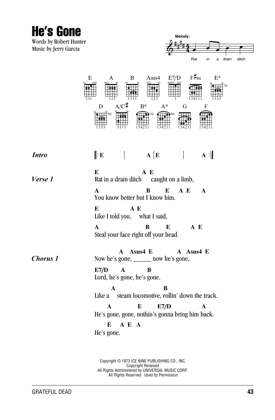 Download or print Grateful Dead He's Gone sheet music, chords and digital score arranged for Guitar Chords/Lyrics. This Rock score includes 3 page(s).