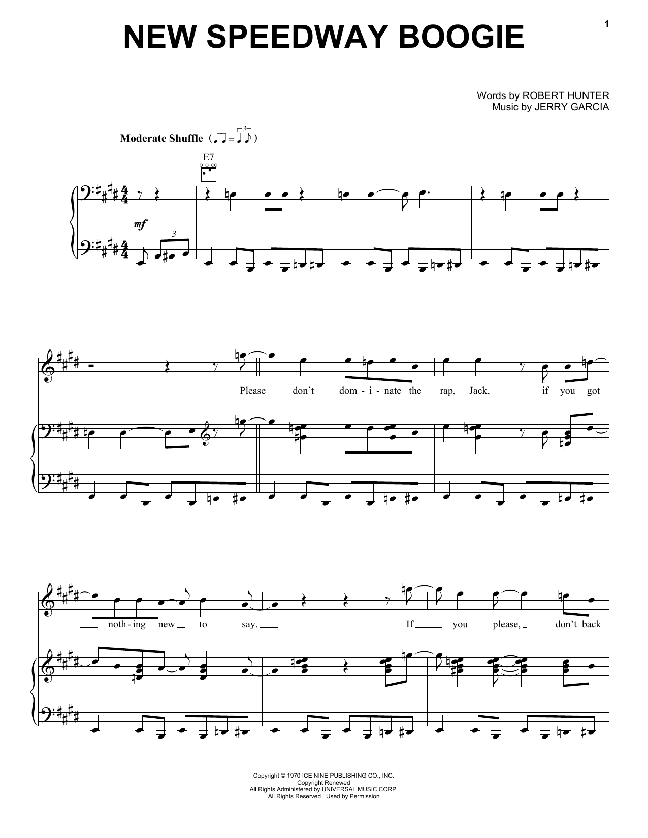 Download or print Grateful Dead New Speedway Boogie sheet music, chords and digital score arranged for Piano, Vocal & Guitar Chords (Right-Hand Melody). This Pop score includes 8 page(s).