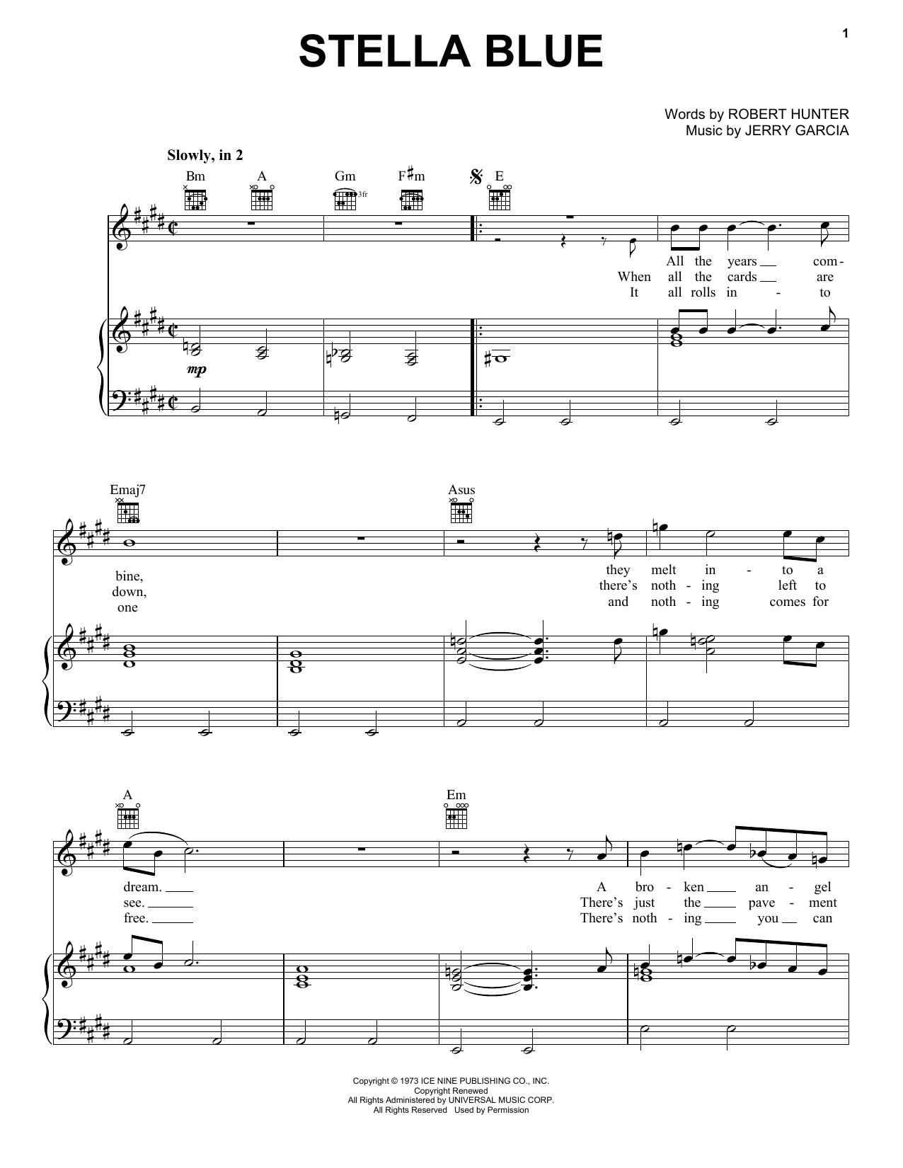 Download or print Grateful Dead Stella Blue sheet music, chords and digital score arranged for Piano, Vocal & Guitar Chords (Right-Hand Melody). This Pop score includes 5 page(s).
