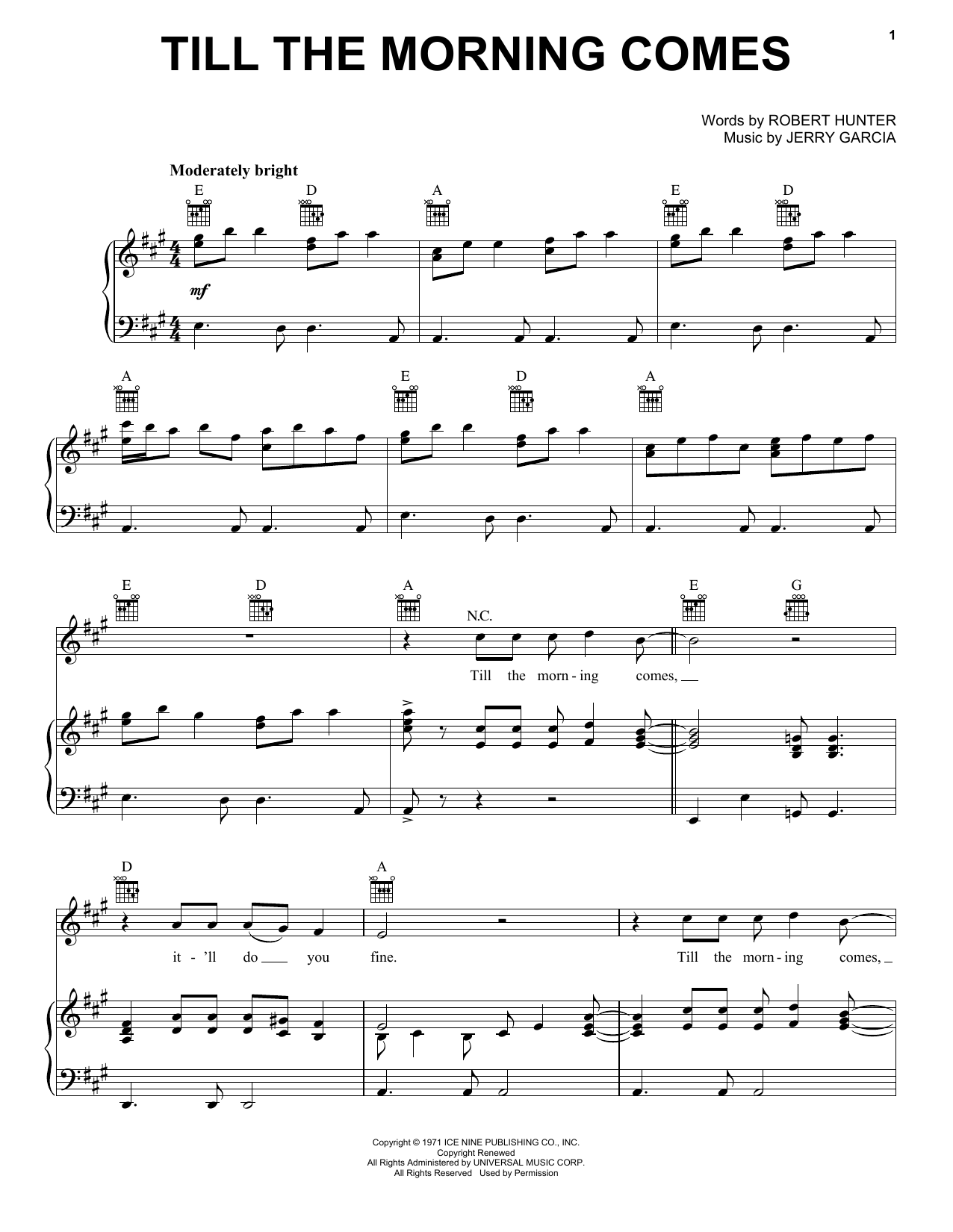 Download or print Grateful Dead Till The Morning Comes sheet music, chords and digital score arranged for Piano, Vocal & Guitar Chords (Right-Hand Melody). This Pop score includes 6 page(s).