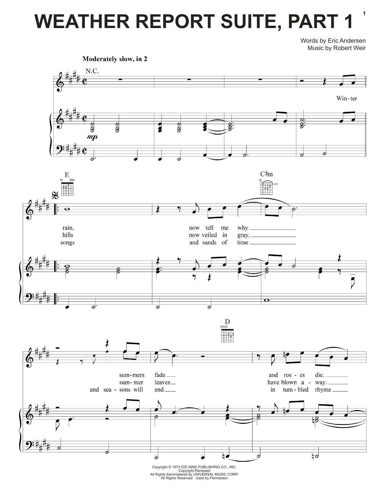 Download or print Grateful Dead Weather Report Suite Part 1 sheet music, chords and digital score arranged for Piano, Vocal & Guitar Chords (Right-Hand Melody). This Pop score includes 5 page(s).