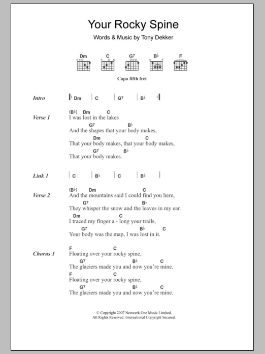 Download or print Great Lake Swimmers Your Rocky Spine sheet music, chords and digital score arranged for Guitar Chords/Lyrics. This Pop score includes 2 page(s).