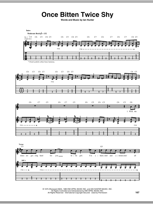 Download or print Great White Once Bitten Twice Shy sheet music, chords and digital score arranged for Easy Guitar Tab. This Blues score includes 5 page(s).