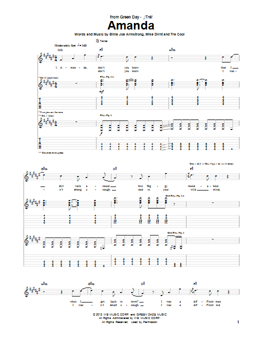 Download or print Green Day Amanda sheet music, chords and digital score arranged for Guitar Tab. This Pop score includes 6 page(s).
