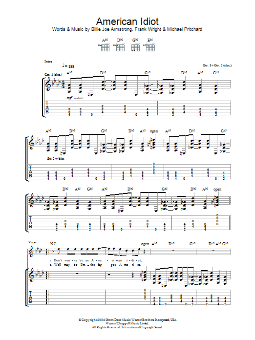Download or print Green Day American Idiot sheet music, chords and digital score arranged for Guitar Tab. This Rock score includes 6 page(s).