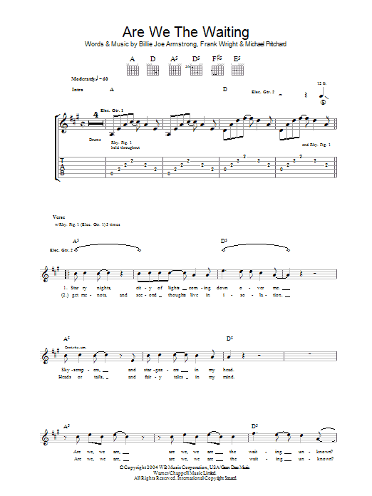 Download or print Green Day Are We The Waiting sheet music, chords and digital score arranged for Guitar Tab. This Pop score includes 3 page(s).