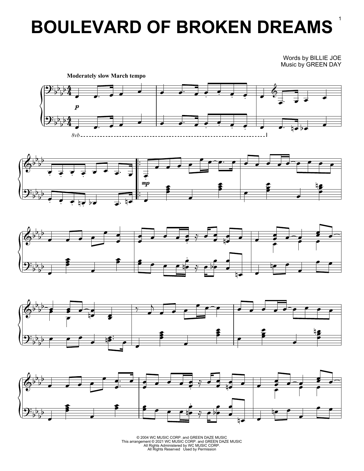 Download or print Green Day Boulevard Of Broken Dreams [Classical version] sheet music, chords and digital score arranged for Piano Solo. This Pop score includes 5 page(s).