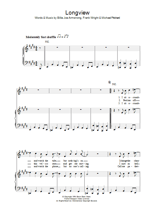 Download or print Green Day Longview sheet music, chords and digital score arranged for Piano, Vocal & Guitar Chords. This Rock score includes 6 page(s).