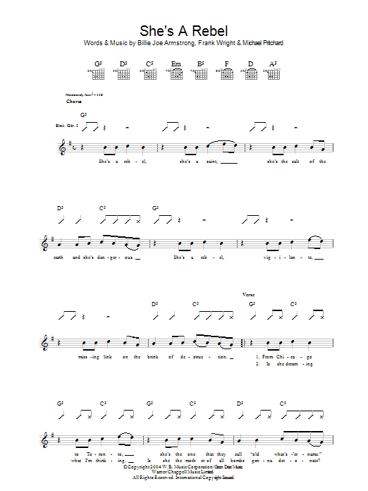 Download or print Green Day She's A Rebel sheet music, chords and digital score arranged for Guitar Tab. This Rock score includes 4 page(s).