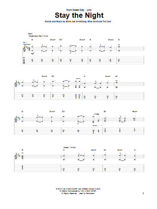 Download or print Green Day Stay The Night sheet music, chords and digital score arranged for Guitar Tab. This Pop score includes 9 page(s).