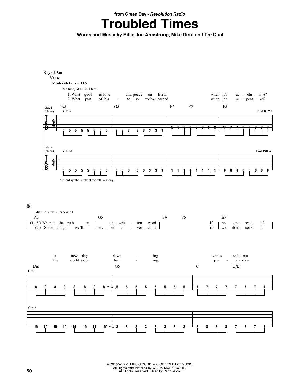 Download or print Green Day Troubled Times sheet music, chords and digital score arranged for Guitar Rhythm Tab. This Pop score includes 5 page(s).