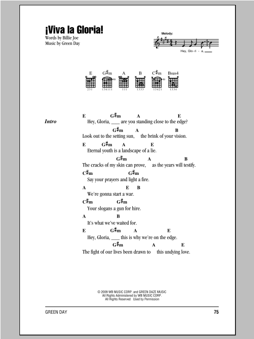 Download or print Green Day Viva La Gloria! sheet music, chords and digital score arranged for Guitar Chords/Lyrics. This Pop score includes 3 page(s).