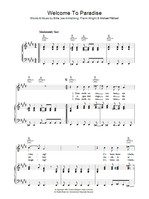 Download or print Green Day Welcome To Paradise sheet music, chords and digital score arranged for Guitar Chords/Lyrics. This Rock score includes 2 page(s).