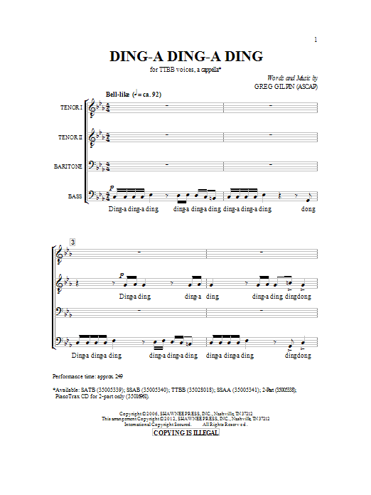 Download or print Greg Gilpin Ding-a Ding-a Ding sheet music, chords and digital score arranged for TB Choir. This Christmas score includes 11 page(s).
