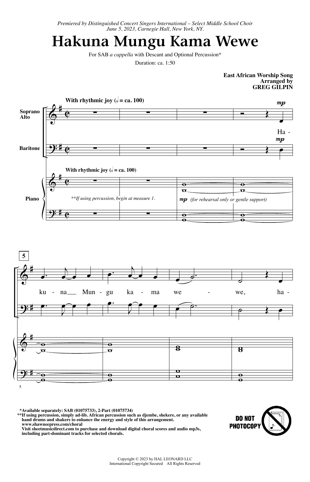 Download or print Greg Gilpin Hakuna Mungu Kama Wewe sheet music, chords and digital score arranged for SAB Choir. This Concert score includes 10 page(s).