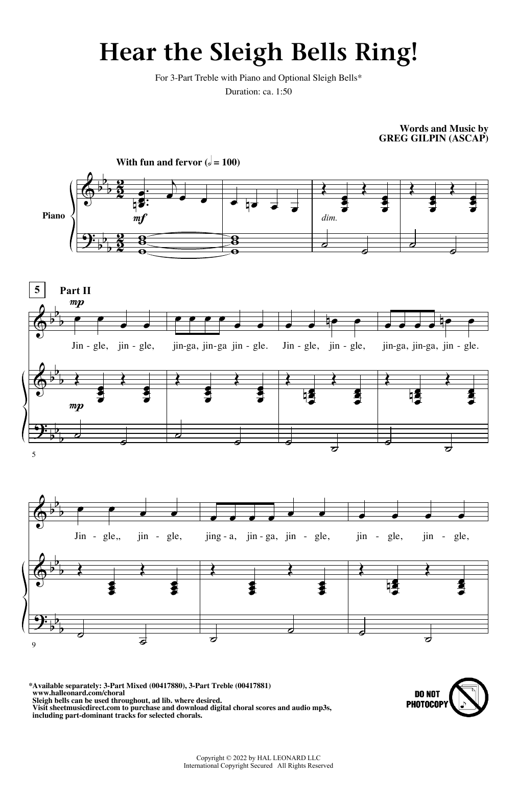 Download or print Greg Gilpin Hear the Sleigh Bells Ring! sheet music, chords and digital score arranged for 3-Part Treble Choir. This Holiday score includes 11 page(s).