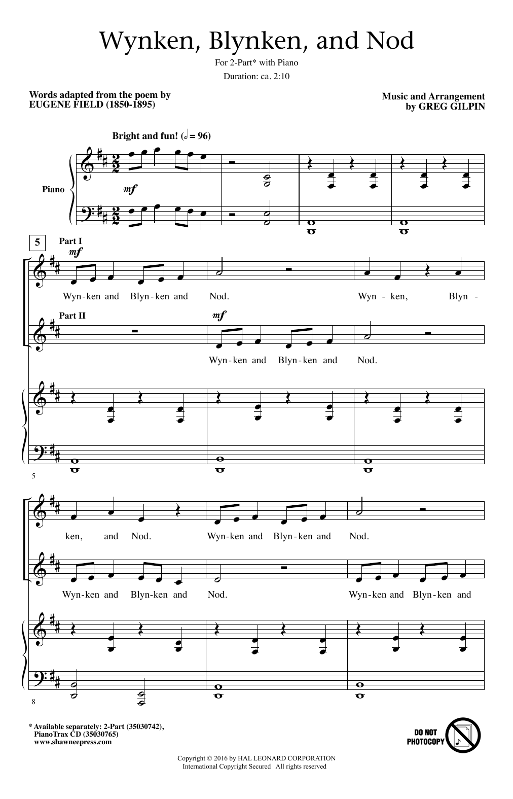 Download or print Greg Gilpin Wynken, Blynken, And Nod sheet music, chords and digital score arranged for 2-Part Choir. This Pop score includes 11 page(s).
