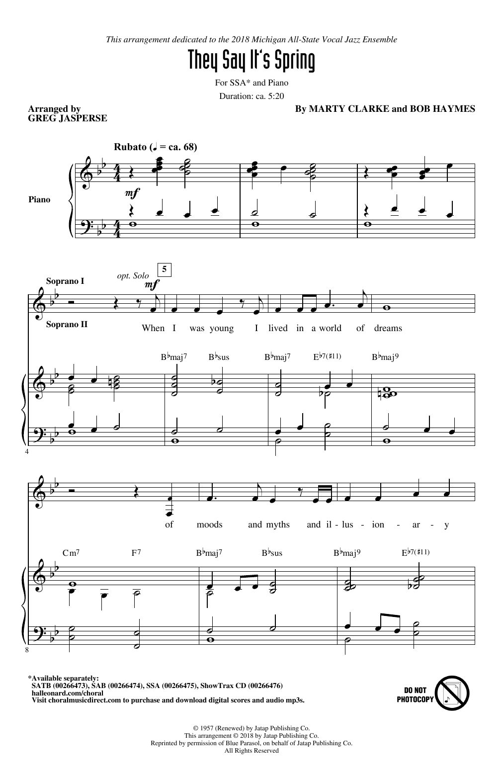 Download or print Greg Jasperse They Say It's Spring sheet music, chords and digital score arranged for SSA Choir. This Jazz score includes 19 page(s).