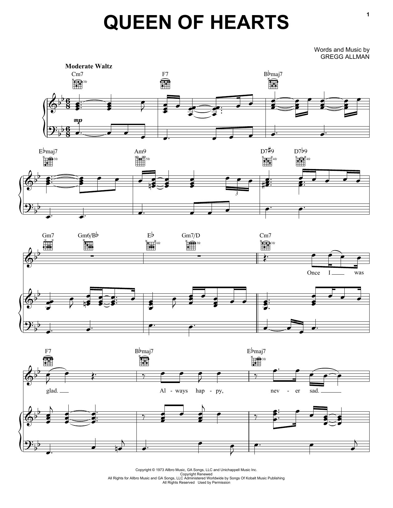 Download or print Gregg Allman Queen Of Hearts sheet music, chords and digital score arranged for Piano, Vocal & Guitar Chords (Right-Hand Melody). This Rock score includes 5 page(s).