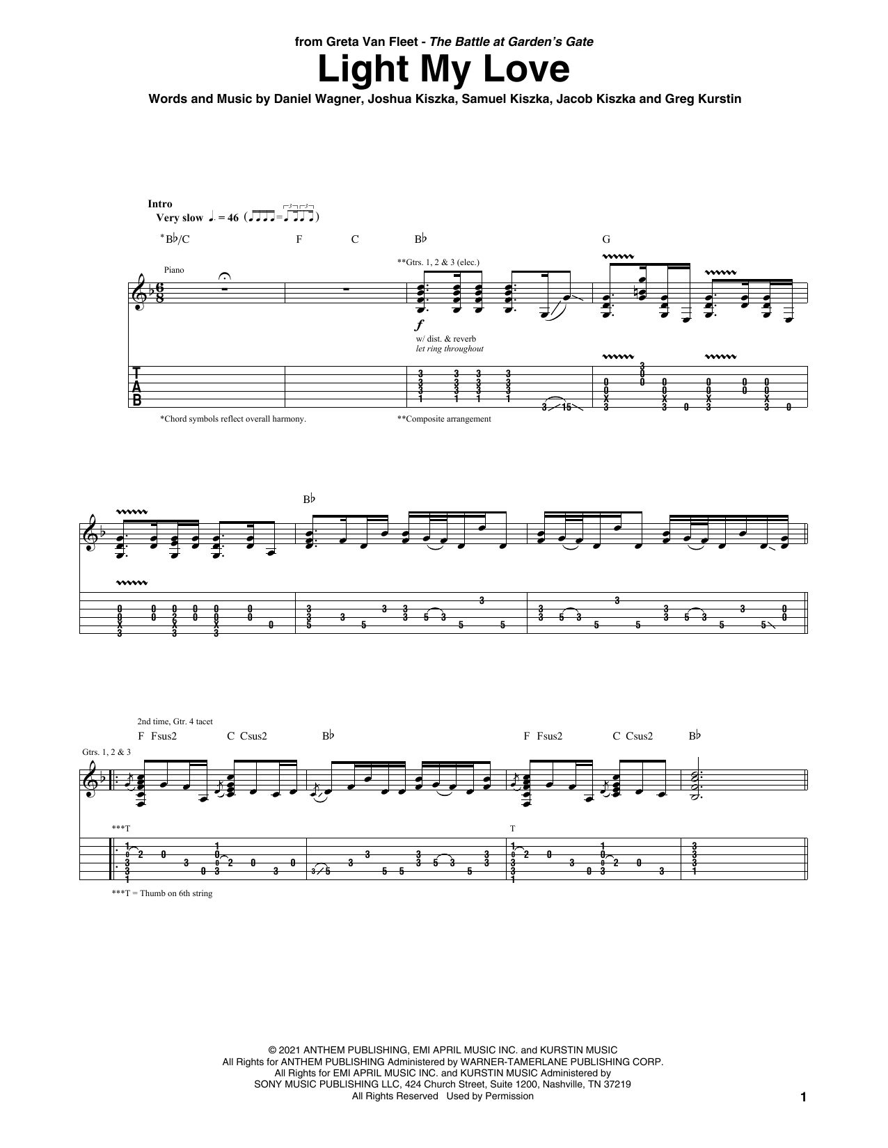 Download or print Greta Van Fleet Light My Love sheet music, chords and digital score arranged for Guitar Tab. This Rock score includes 5 page(s).