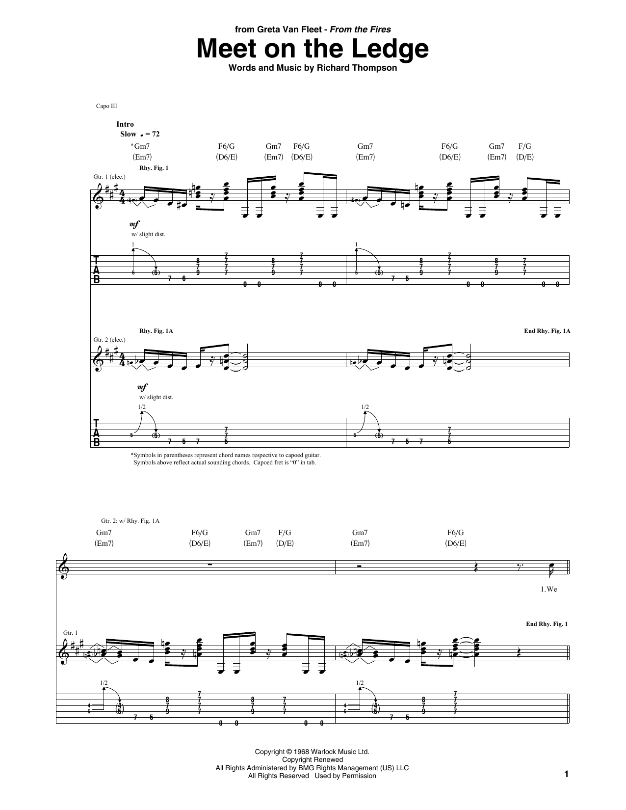 Download or print Greta Van Fleet Meet On The Ledge sheet music, chords and digital score arranged for Guitar Tab. This Rock score includes 8 page(s).