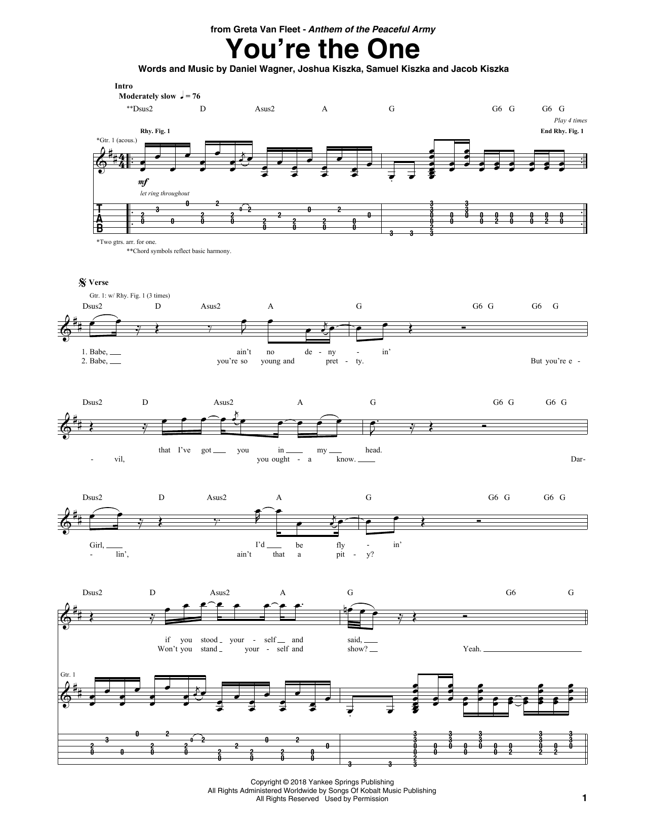 Download or print Greta Van Fleet You're The One sheet music, chords and digital score arranged for Guitar Tab. This Pop score includes 8 page(s).
