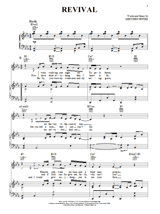 Download or print Gretchen Peters Revival sheet music, chords and digital score arranged for Piano, Vocal & Guitar Chords (Right-Hand Melody). This Country score includes 4 page(s).