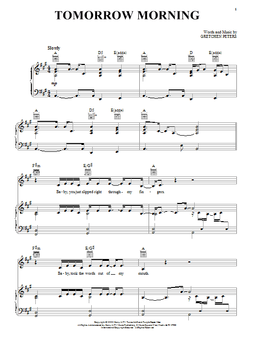 Download or print Gretchen Peters Tomorrow Morning sheet music, chords and digital score arranged for Guitar Chords/Lyrics. This Pop score includes 2 page(s).