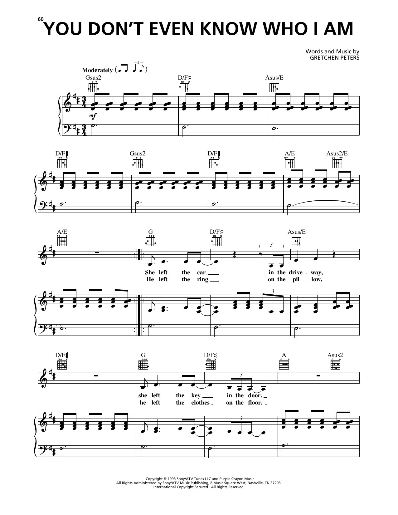 Download or print Gretchen Peters You Don't Even Know Who I Am sheet music, chords and digital score arranged for Piano, Vocal & Guitar Chords (Right-Hand Melody). This Country score includes 5 page(s).