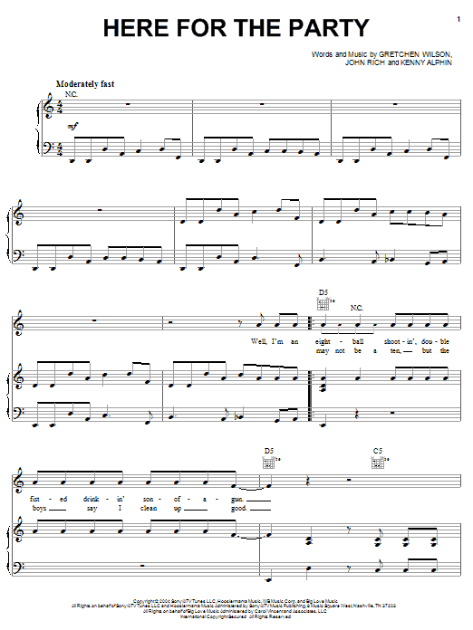 Download or print Gretchen Wilson Here For The Party sheet music, chords and digital score arranged for Piano, Vocal & Guitar Chords (Right-Hand Melody). This Country score includes 7 page(s).