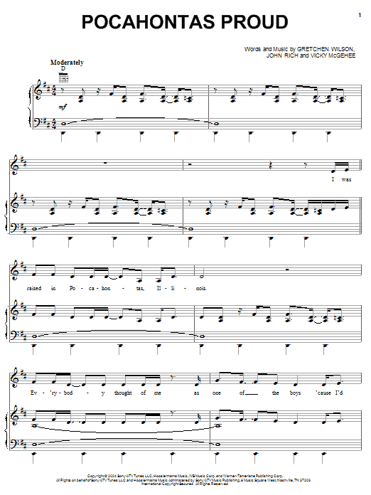Download or print Gretchen Wilson Pocahontas Proud sheet music, chords and digital score arranged for Piano, Vocal & Guitar Chords (Right-Hand Melody). This Country score includes 12 page(s).