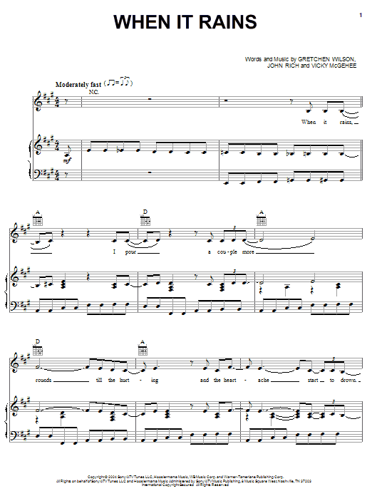 Download or print Gretchen Wilson When It Rains sheet music, chords and digital score arranged for Piano, Vocal & Guitar Chords (Right-Hand Melody). This Country score includes 7 page(s).