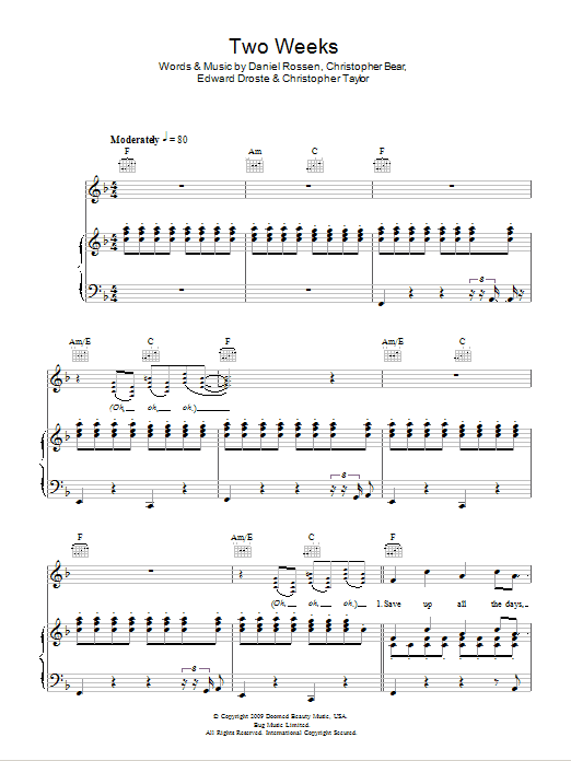 Download or print Grizzly Bear Two Weeks sheet music, chords and digital score arranged for Piano, Vocal & Guitar Chords. This Alternative score includes 6 page(s).