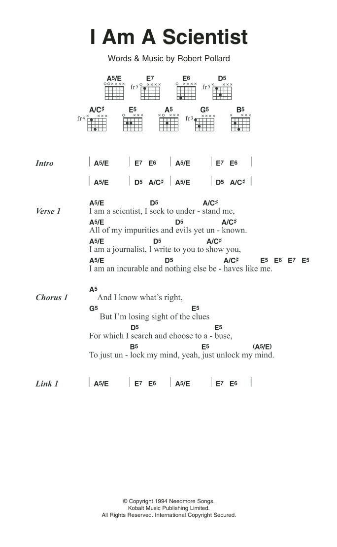 Download or print Guided By Voices I Am A Scientist sheet music, chords and digital score arranged for Guitar Chords/Lyrics. This Rock score includes 2 page(s).