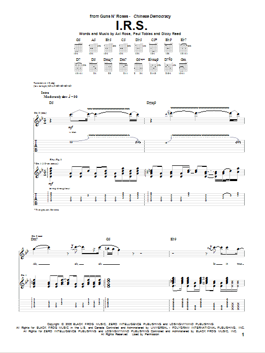 Download or print Guns N' Roses I.R.S. sheet music, chords and digital score arranged for Guitar Tab. This Metal score includes 20 page(s).