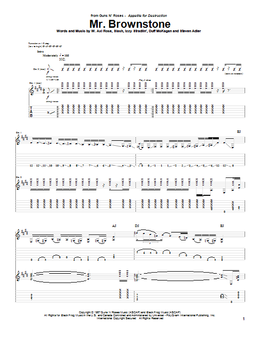 Download or print Guns N' Roses Mr. Brownstone sheet music, chords and digital score arranged for Guitar Tab (Single Guitar). This Rock score includes 8 page(s).