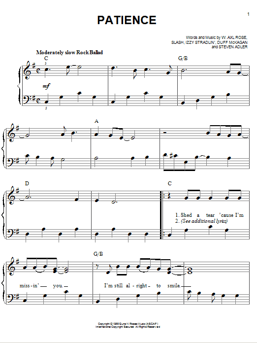 Download or print Guns N' Roses Patience sheet music, chords and digital score arranged for Easy Piano. This Pop score includes 4 page(s).
