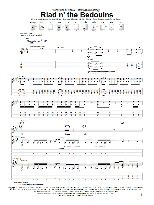 Download or print Guns N' Roses Riad N' The Bedouins sheet music, chords and digital score arranged for Guitar Tab. This Metal score includes 18 page(s).