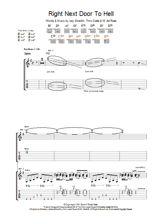 Download or print Guns N' Roses Right Next Door To Hell sheet music, chords and digital score arranged for Guitar Chords/Lyrics. This Rock score includes 3 page(s).