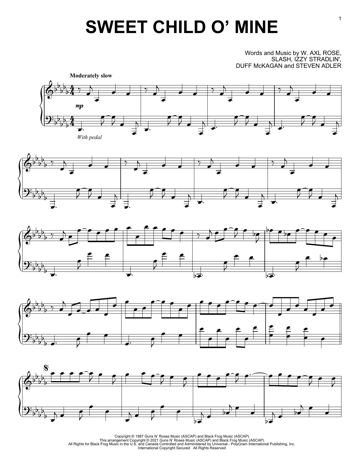 Download or print Guns N' Roses Sweet Child O' Mine [Classical version] sheet music, chords and digital score arranged for Piano Solo. This Rock score includes 5 page(s).