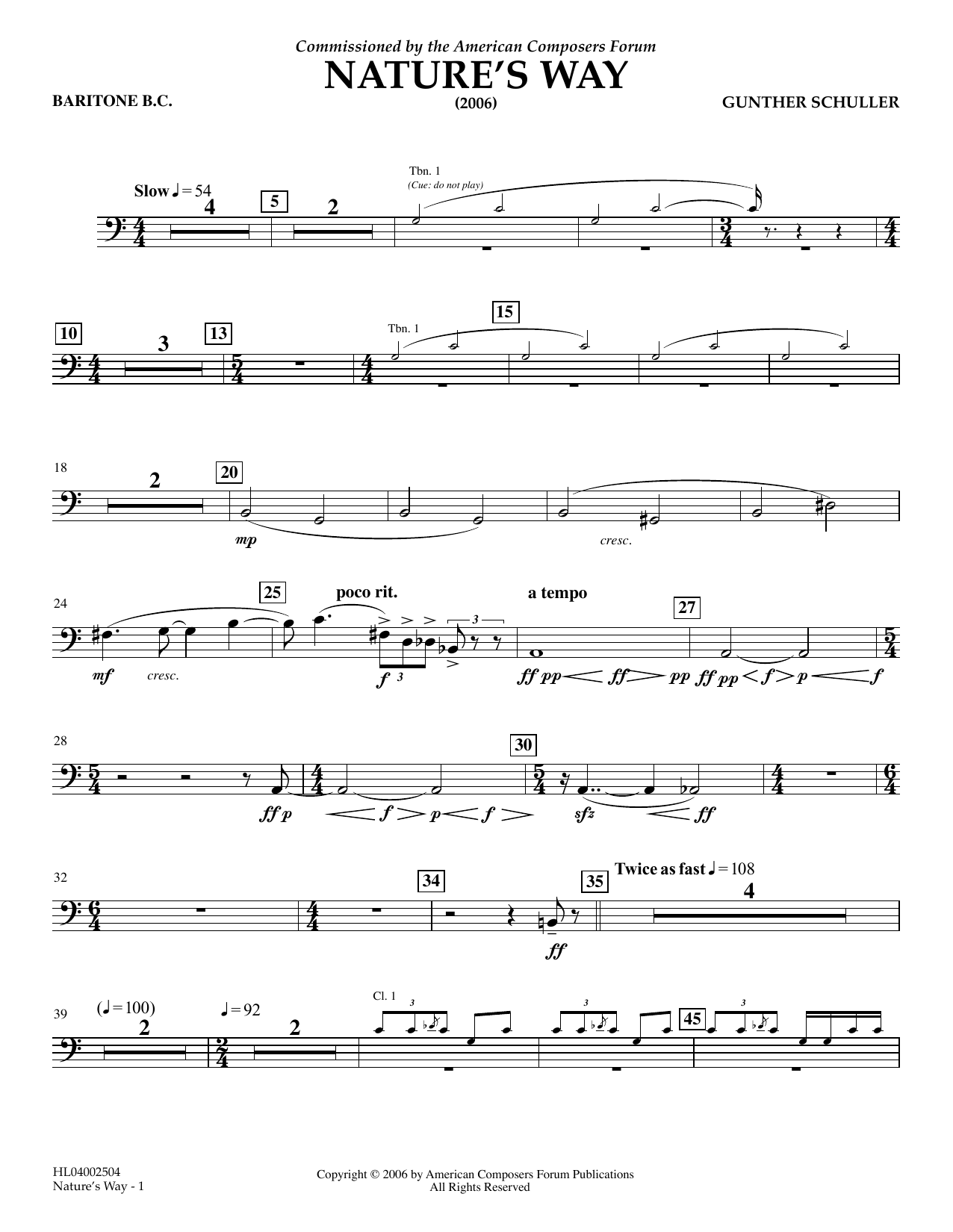 Download or print Gunther Schuller Nature's Way - Baritone B.C. sheet music, chords and digital score arranged for Concert Band. This Concert score includes 2 page(s).