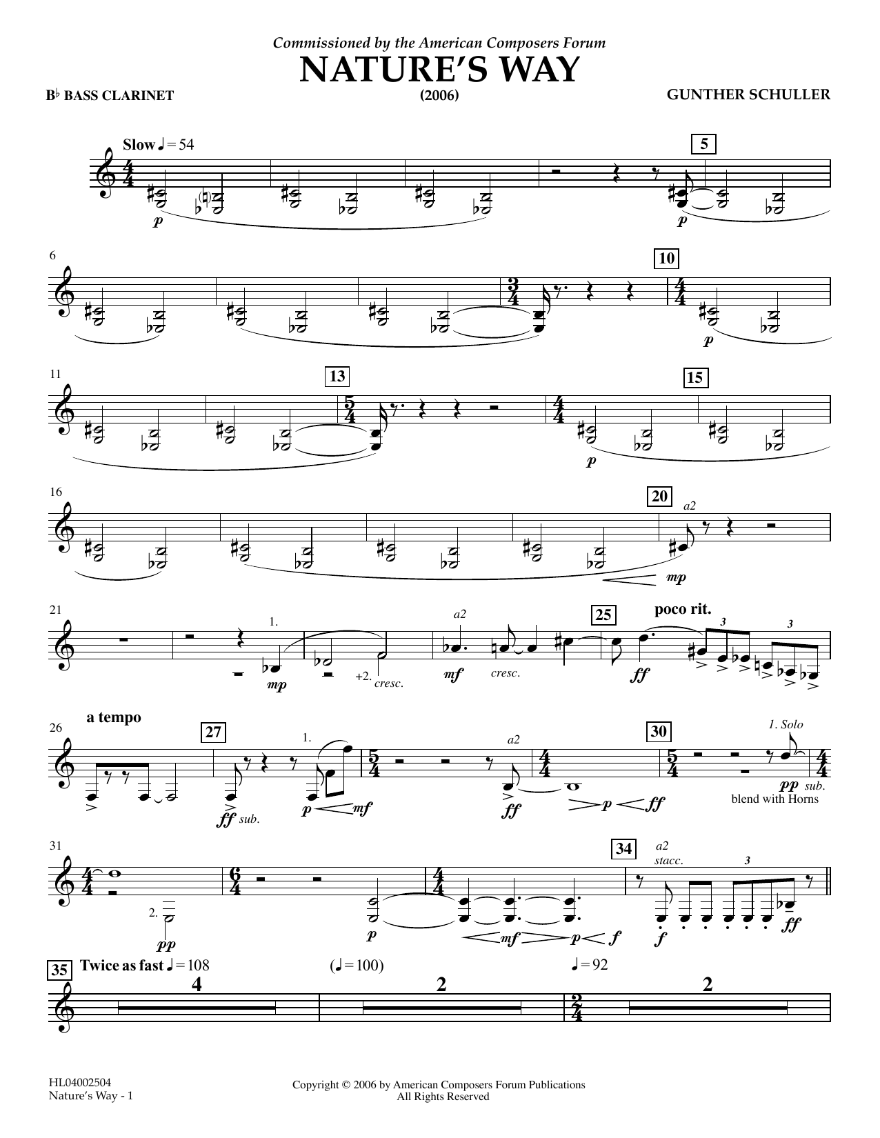 Download or print Gunther Schuller Nature's Way - Bb Bass Clarinet 1, 2 sheet music, chords and digital score arranged for Concert Band. This Concert score includes 2 page(s).