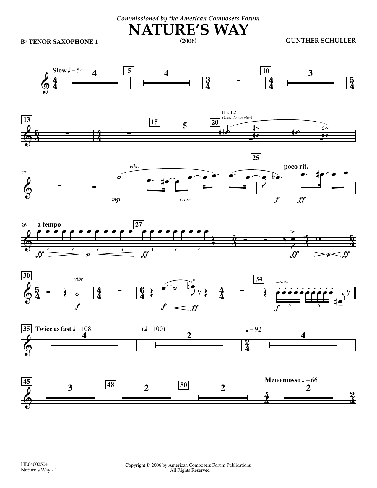 Download or print Gunther Schuller Nature's Way - Bb Tenor Saxophone 1 sheet music, chords and digital score arranged for Concert Band. This Concert score includes 2 page(s).