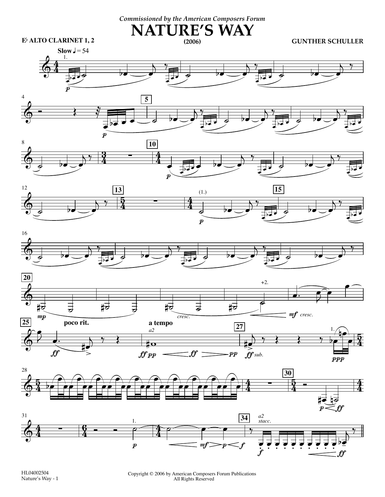 Download or print Gunther Schuller Nature's Way - Eb Alto Clarinet 1,2 sheet music, chords and digital score arranged for Concert Band. This Concert score includes 2 page(s).