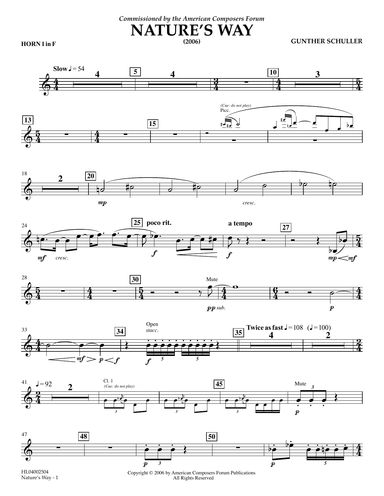 Download or print Gunther Schuller Nature's Way - F Horn 1 sheet music, chords and digital score arranged for Concert Band. This Concert score includes 2 page(s).