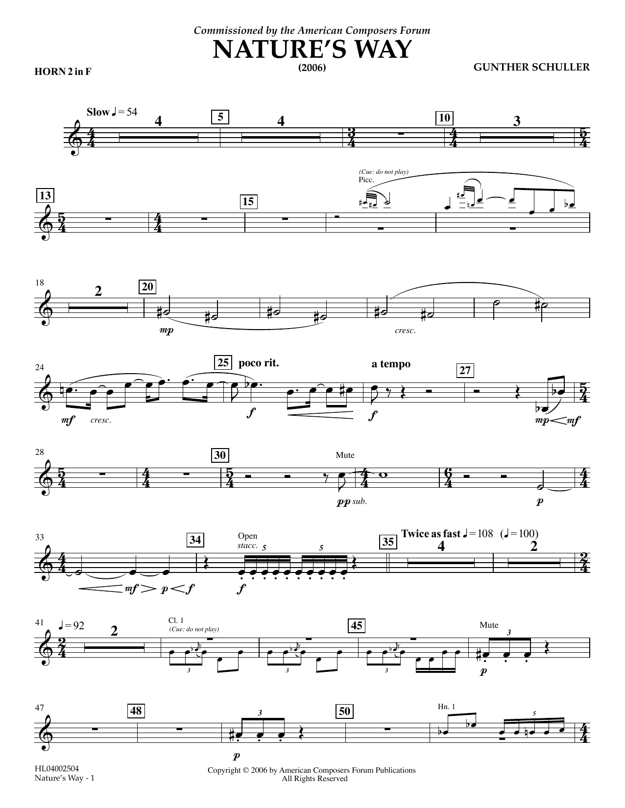 Download or print Gunther Schuller Nature's Way - F Horn 2 sheet music, chords and digital score arranged for Concert Band. This Concert score includes 2 page(s).