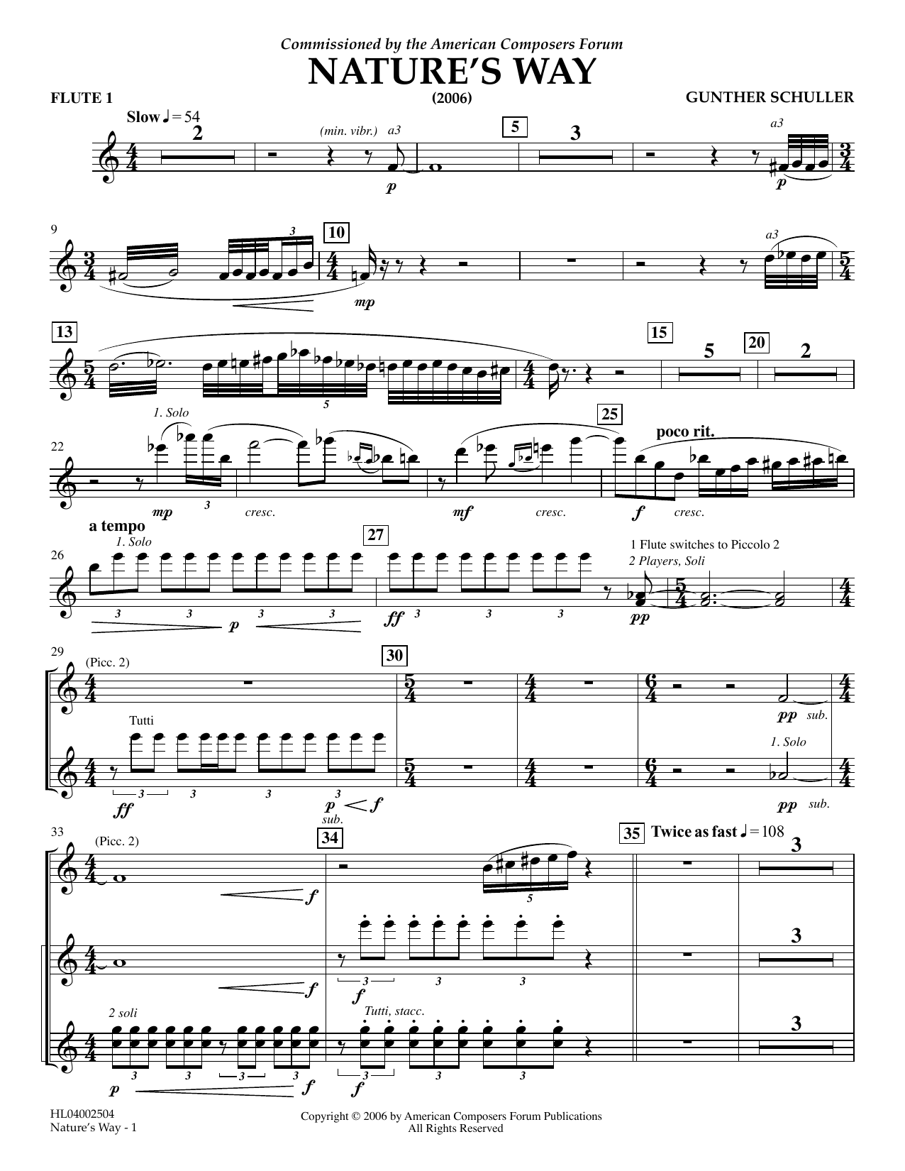 Download or print Gunther Schuller Nature's Way - Flute 1 sheet music, chords and digital score arranged for Concert Band. This Concert score includes 3 page(s).